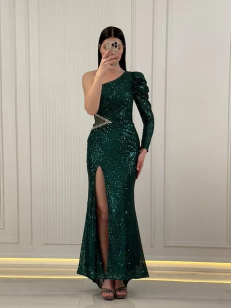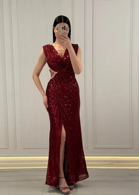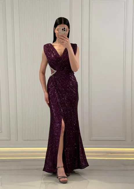 لباس شب دو سینه با یقه V با جزییات سنگی