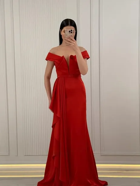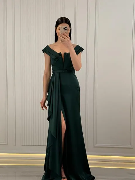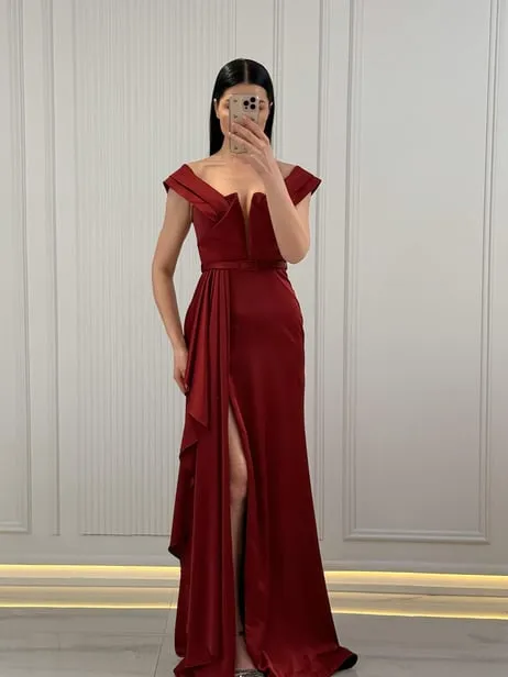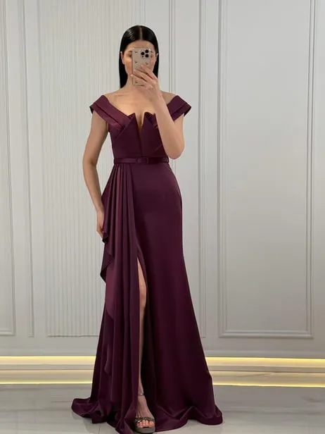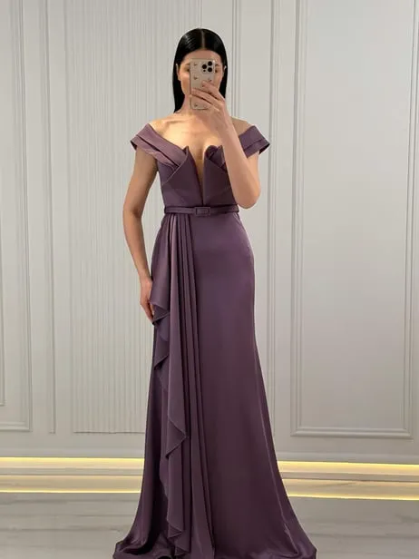 لباس شب بلند ساتن با یقه V عمیق کمربند شانه ای