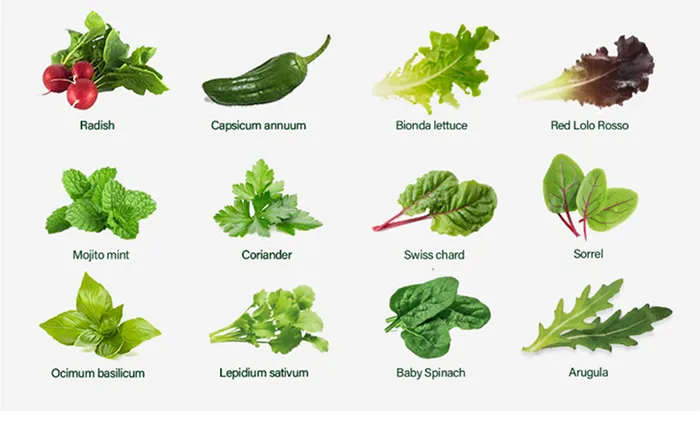 ما تنوع بالایی از سبزیجات را برای شما تدارک دیده‌ایم: ریحان ایتالیایی، نعناع موهیتو، بیبی اسفناج، روکولا، سورل، کاهو لولوروسو، کاهو بیوندا، سوئیس چارد، فلفل سبز، جعفری و انواع برگ‌های خوراکی.