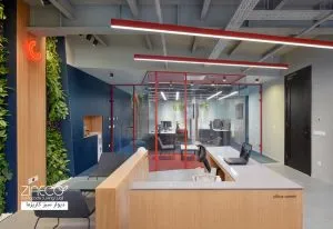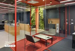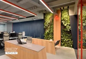 در طراحی این پروژه از چوب به عنوان یکی از مصالح اصلی استفاده شده است. چوب به عنوان یک ماده طبیعی، علاوه بر زیبایی ظاهری، حس آرامش و گرما را به محیط اداری می‌آورد. این انتخاب به ایجاد فضایی دلنشین و راحت برای کارکنان و بازدیدکنندگان کمک می‌کند. استفاده از چوب در کنار گیاهان سبز، هماهنگی خوبی ایجاد کرده که موجب راحتی و بهبود محیط کار می‌شود.