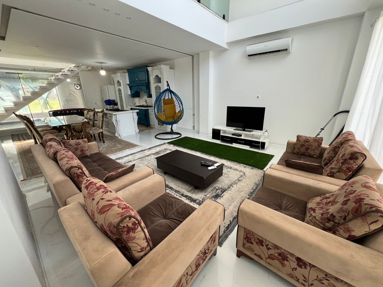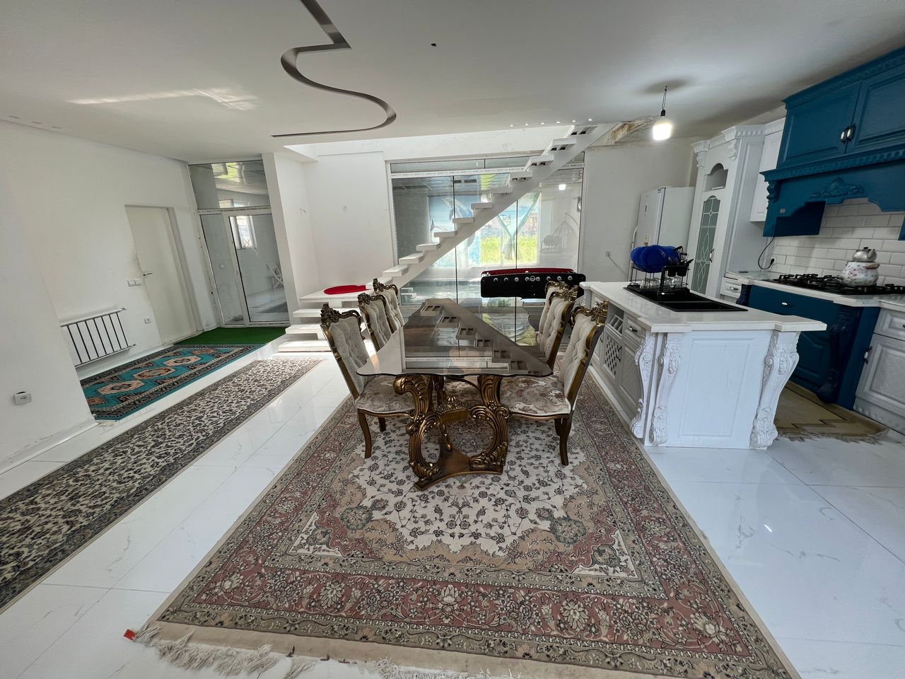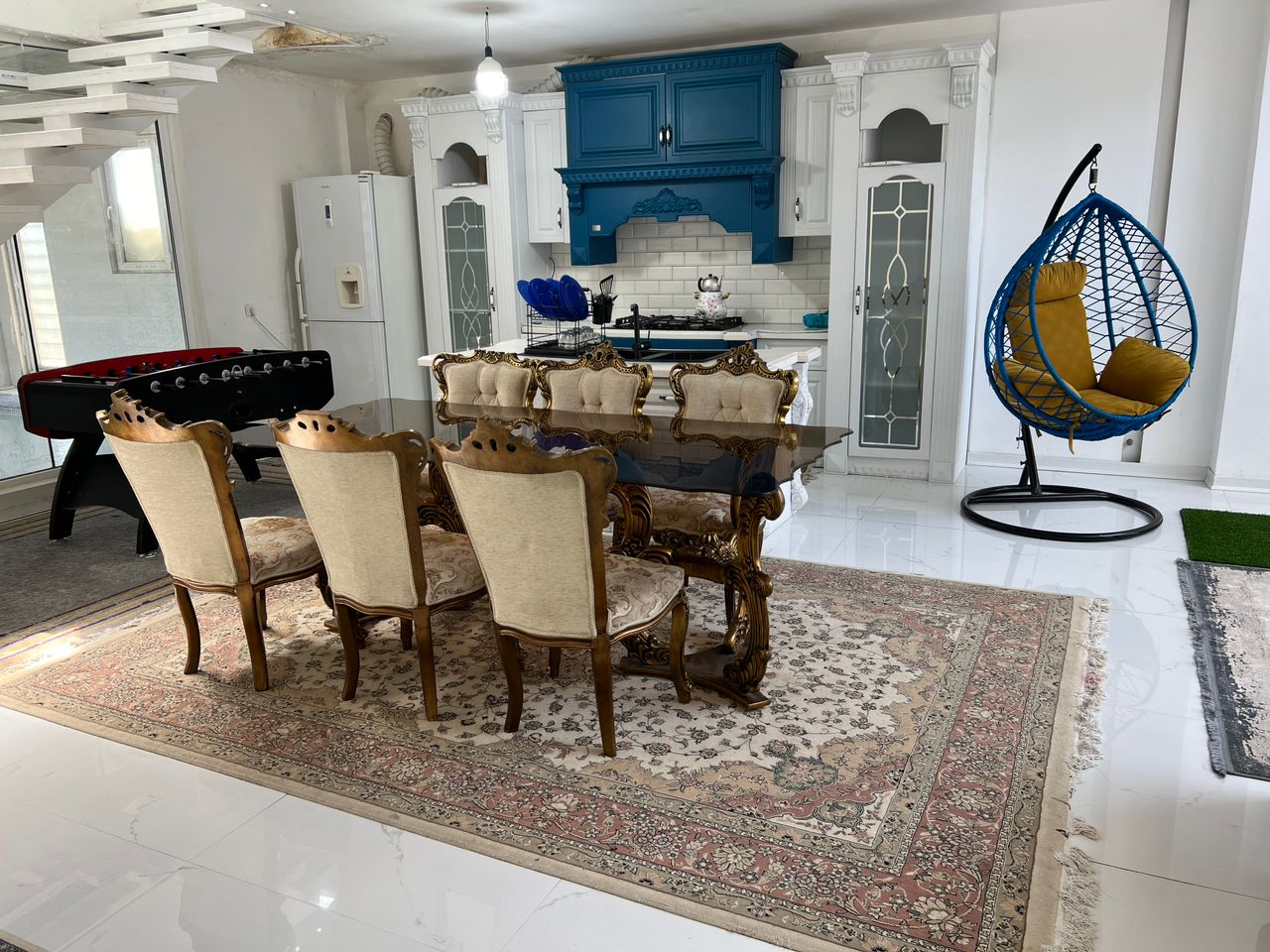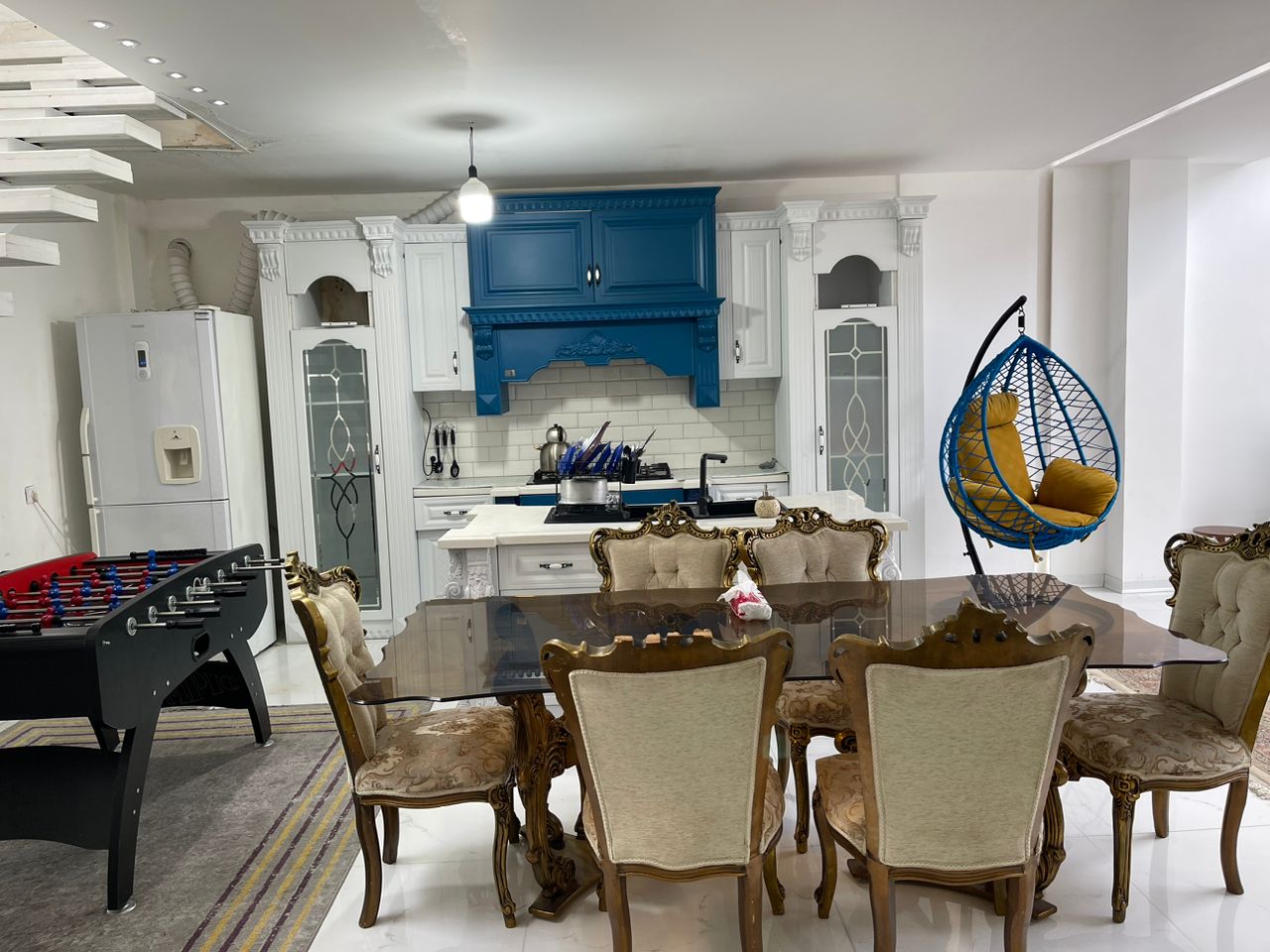 ✅طبقه اول : نشیمن بسیار زیبا آشپزخانه میز نهار خوری یک اتاق و یک سرویس ایرانی و فرنگی و استخر سر بسته و میز فوتبال دستی