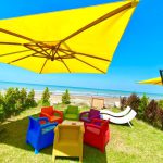 تخت استخری برای افتاب گرفتن در ساحل همراه با چتر سایبان